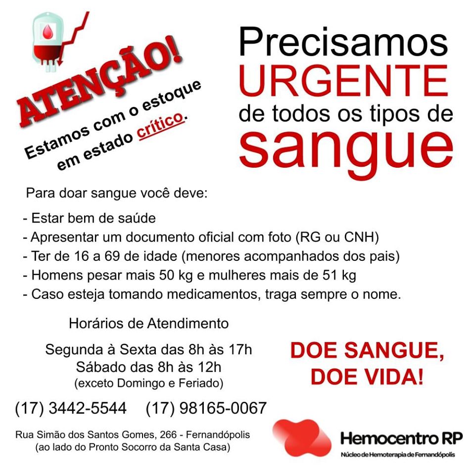 O horário de funcionamento do Hemocentro de Fernandópolis é de segunda a sexta-feira, das 8h às 17h. Aos sábados das 8h às 12h. A unidade fica na Rua Simão dos Santos Gomes, n.º 266, no Jardim Santista, ao lado do Pronto Socorro da Santa Casa de Fernandópolis. Informações pelo (17) 3442-5544.