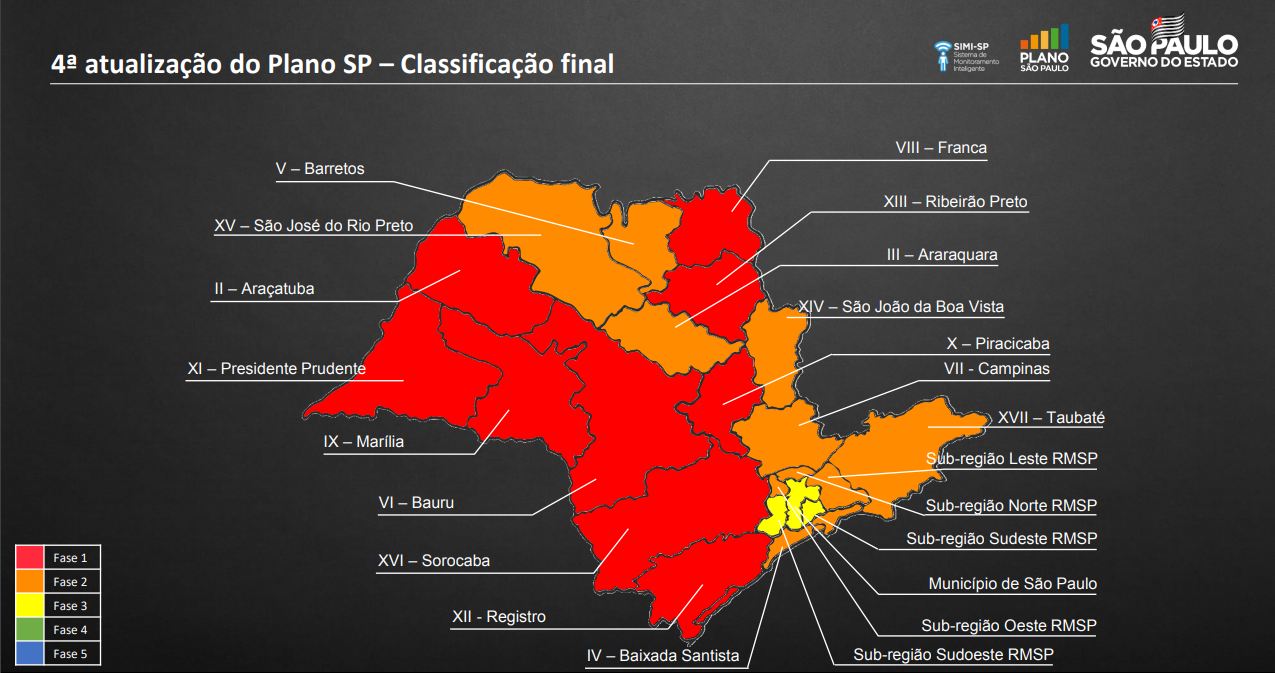 Há dois critérios para cálculo da fase de risco e enquadramento de cada região: capacidade de resposta do sistema de saúde e evolução da epidemia.