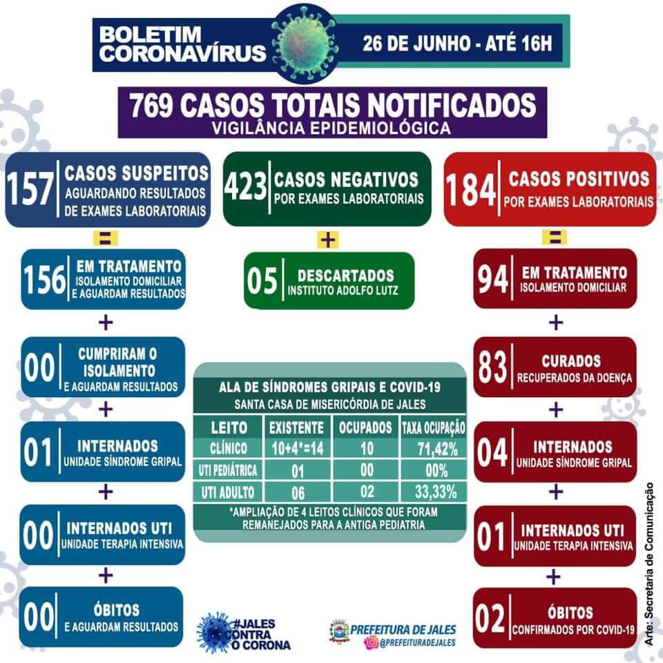 Jales teve nesta sexta-feira, 26, mais um óbito confirmado de coronavírus. A vítima é uma mulher de 59 anos e que estava internada na UTI da Santa Casa.