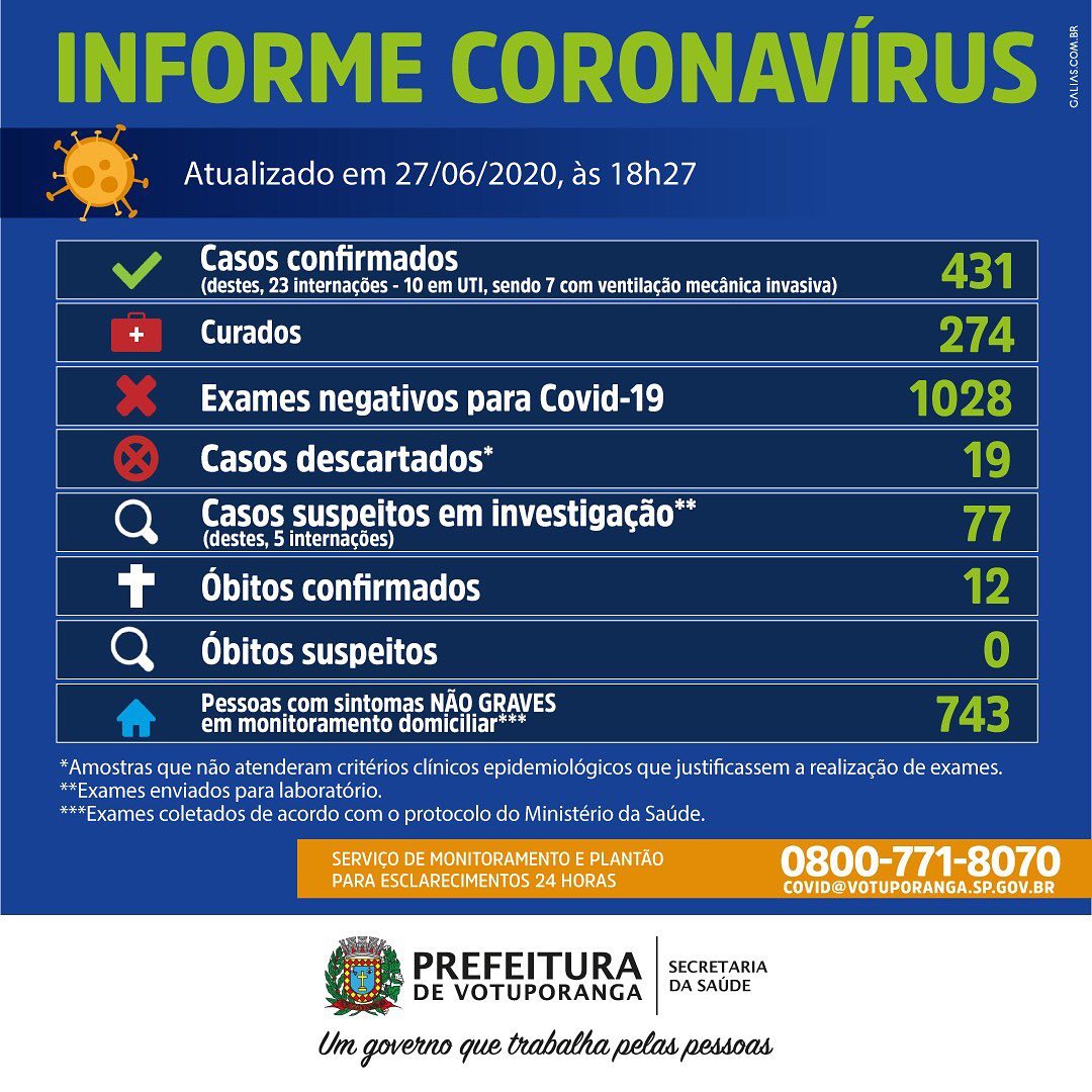 O município tem 431 casos confirmados, com 274 curados e 1028 testes negativos.