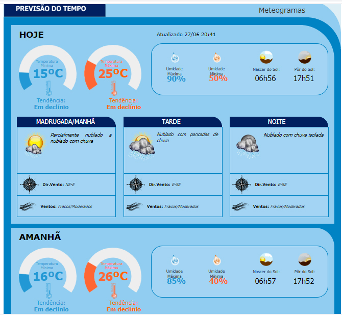 Print screen da página digital do Instituto Nacional de Meteorologia com os dados locais de hoje e amanhã