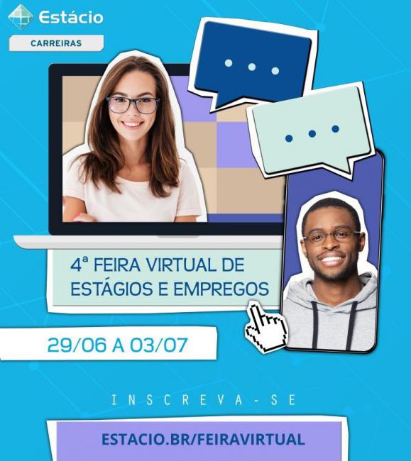 Acontecerá entre os dias 29 de junho a 3 de julho, a 4ª edição da Feira Virtual de Estágios e Empregos, promovida pela Estácio, que oferecerá mais de 4 mil vagas pelo Brasil.