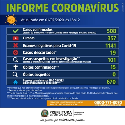 Também nesta segunda, a Pasta registrou o 15° óbito por Covid-19 no Município. Um idosa, de 74 anos, que tinha comorbidades e encontrava-se hospitalizado. O início dos primeiros sintomas foi apresentado no último dia 29 de junho.