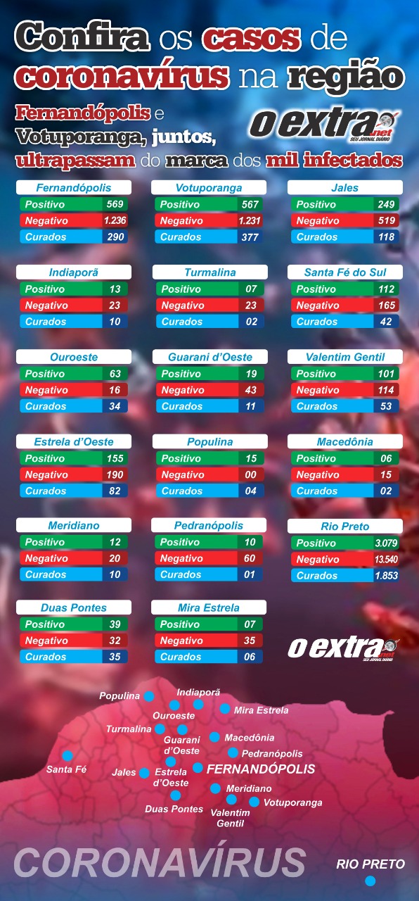 Fernandópolis confirmou nesta sexta-feira, 3, mais 27 casos da doença, na comparação com quinta, chegando aos 569 infectados. Destes, 290 estão curados da doença. O último boletim ainda informa que são 1.236 testes negativos e 9 óbitos.