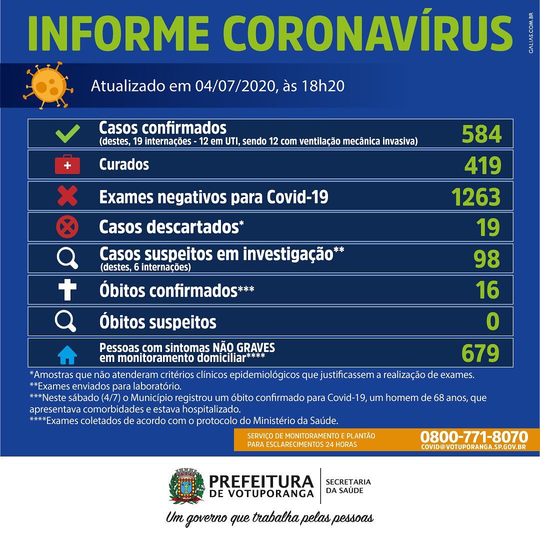 Também neste sábado (4), a Pasta registrou o 16° óbito por Covid-19 no Município. Um idoso, de 68 anos, que tinha comorbidades e encontrava-se hospitalizado. O início dos primeiros sintomas foi apresentado no dia 29 de maio.