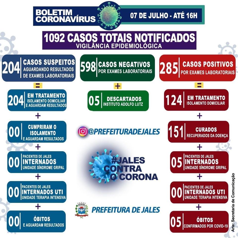 Nesta terça-feira, 7 de julho, foram registrados no município de Jales mais 30 notificações de casos suspeitos para a Covid-19, nas últimas 24 horas.