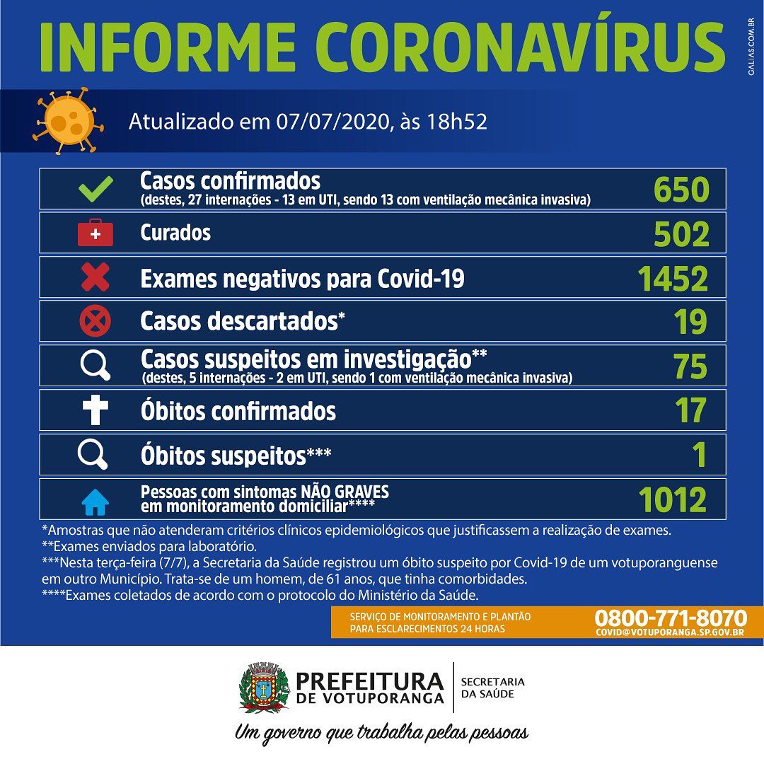 Também nesta terça-feira (7/7), a Pasta registrou um óbito suspeito por Covid-19 de um votuporanguense em outro Município. Trata-se de um homem, de 61 anos, que tinha comorbidades. A Secretaria aguarda resultado de exame que foi enviado para análise laboratorial.