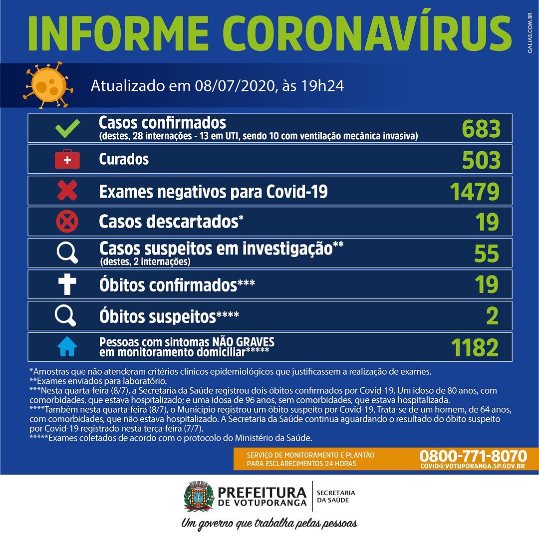 Votuporanga tem 683 casos confirmados, com 503 curados e 1.479 testes negativos.