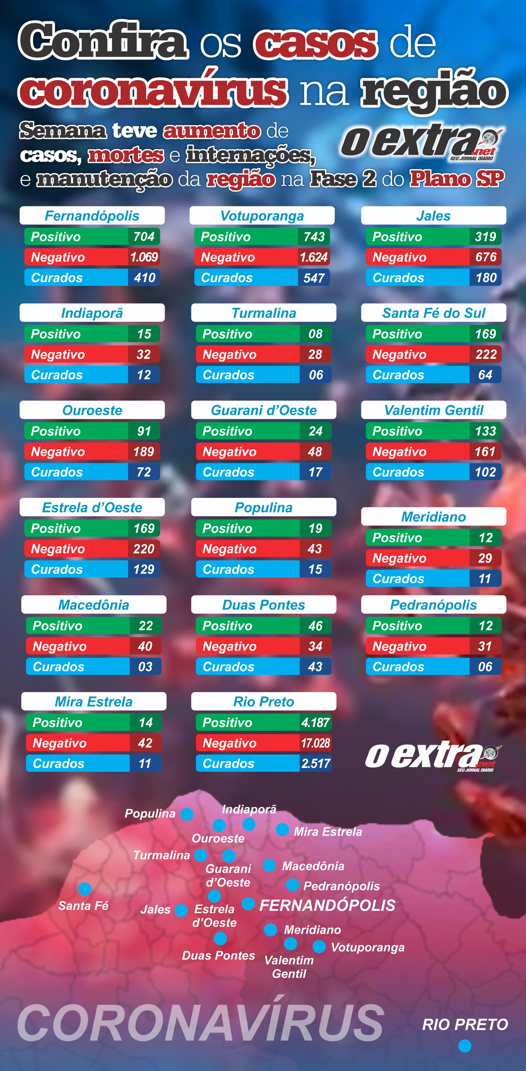 Santa Fé termina a semana com 169 casos positivos e cinco óbitos, e Jales, com alta considerável de confirmações, com 319 testes confirmados e também com cinco mortes pela doença.