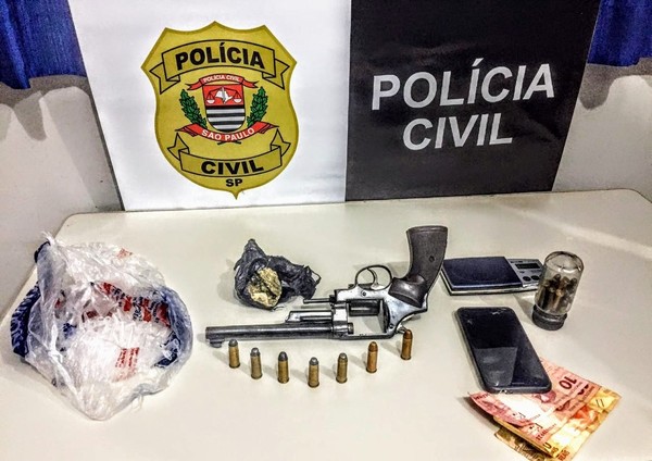 Policiais apreenderam um revólver e munições de vários calibres, além de celulares, porções de maconha e objetos usados no tráfico de drogas