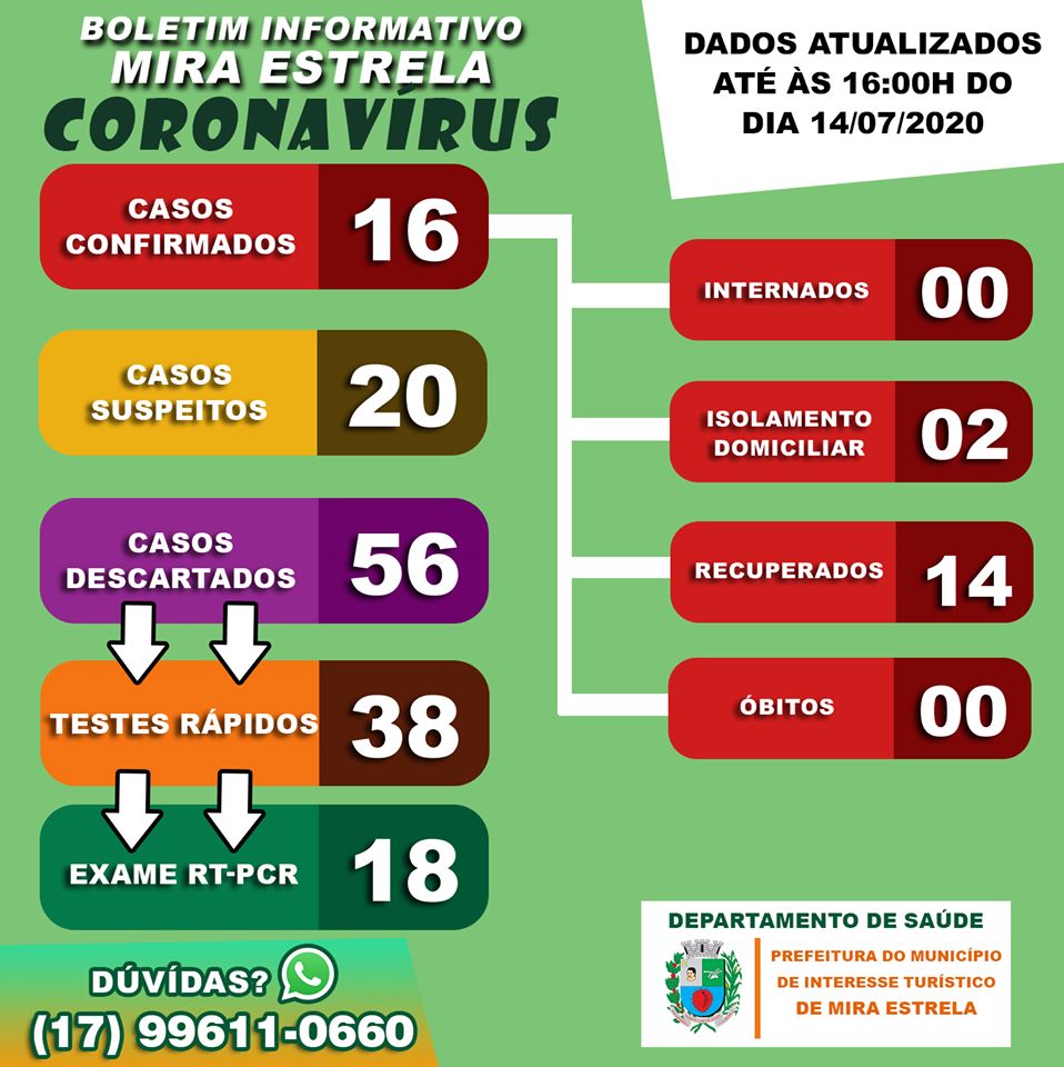 De acordo com o boletim, Mira Estrela registra, até o momento, 16 casos positivos para coronavírus. 14 pessoas foram recuperadas da doença.