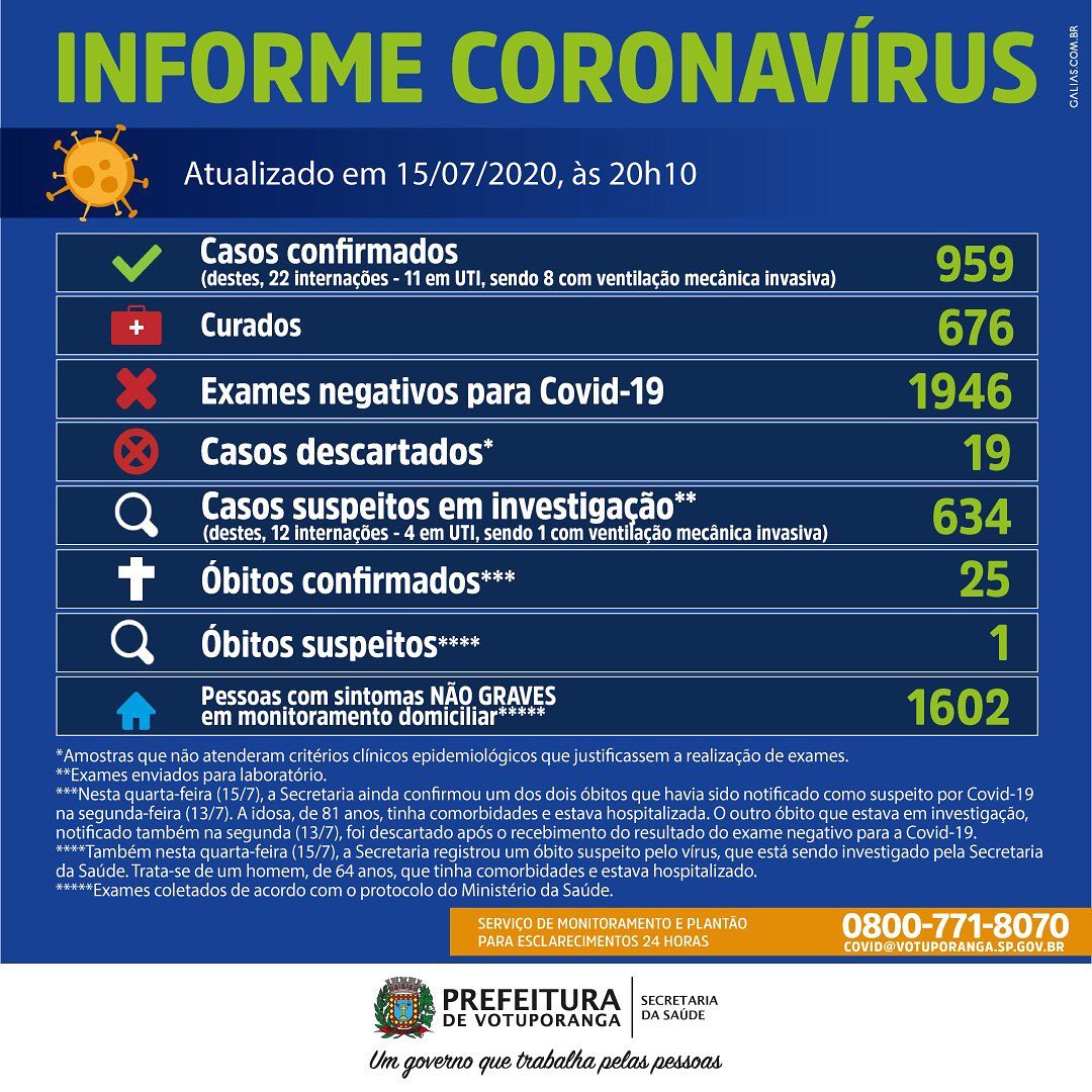Votuporanga tem 959 casos confirmados, com 676 curados e 1.946 testes negativos.