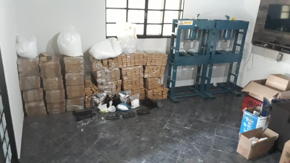 Segundo a polícia, 583 quilos de maconha, vasto material para a manipulação da droga, uma caminhonete com fundo falso e compartimento secreto e outro carro foram apreendidos.