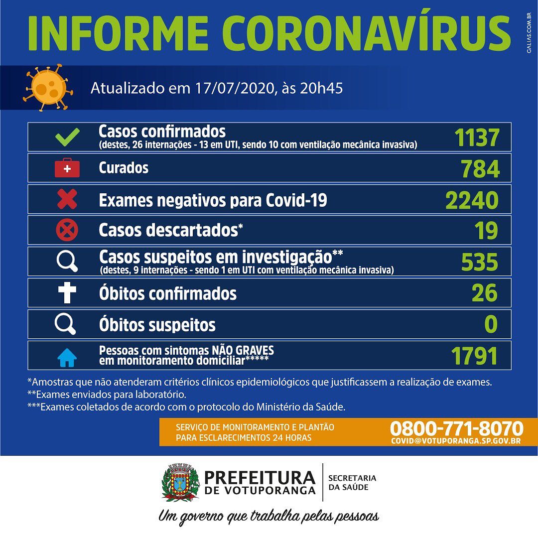 Votuporanga tem 1.137 casos confirmados, com 784 curados e 2.240 testes negativos.