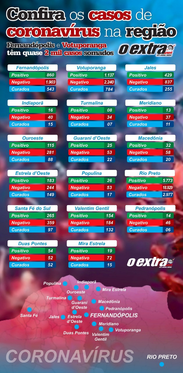 Santa Fé do Sul, que tomou medidas drásticas contra a doença, termina a semana com 265 casos positivos e 10 óbitos, e Jales, com alta considerável de confirmações, com 429 testes e com cinco mortes pela doença.