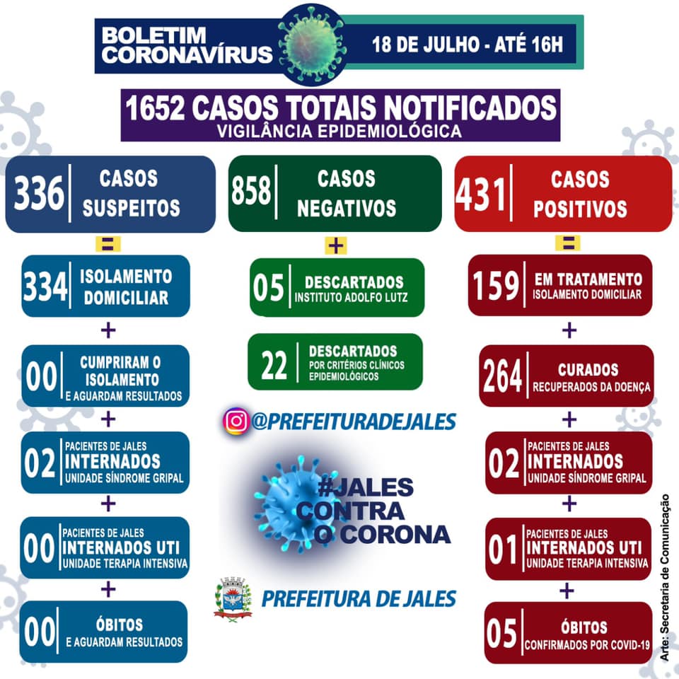 Neste sábado, 18, a Secretaria Municipal de Saúde de Jales informou que o município registrou 55 notificações de casos suspeitos para a Covid-19 nas últimas 24 horas.