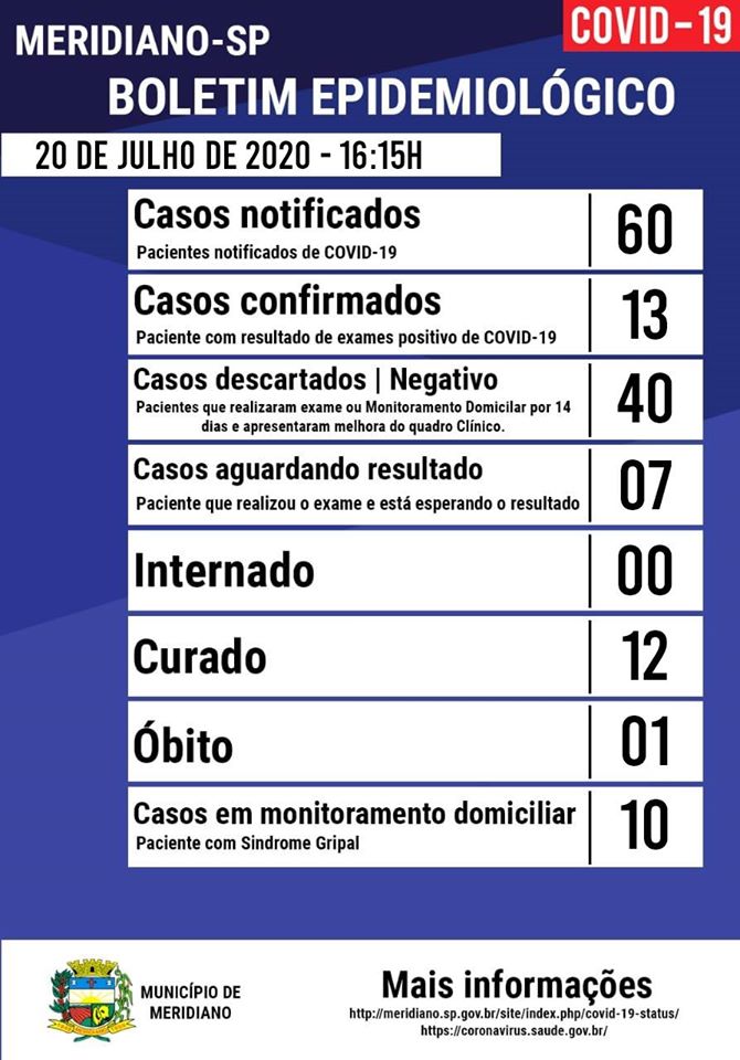 A Prefeitura de Meridiano, município localizado a 14 quilômetros de Fernandópolis, divulgou, na tarde desta segunda-feira, dia 20, boletim epidemiológico sobre as notificações de coronavírus (Covid-19).