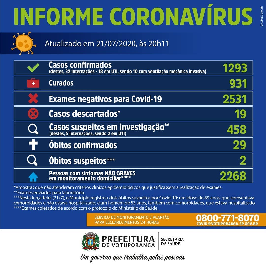 Votuporanga tem 1.293 casos confirmados, com 931 curados e 2.531 testes negativos.