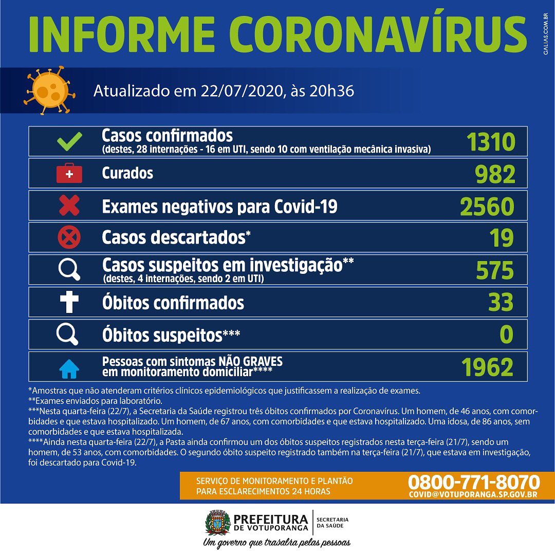 Votuporanga tem 1.310 casos confirmados, com 982 curados e 2.560 testes negativos.