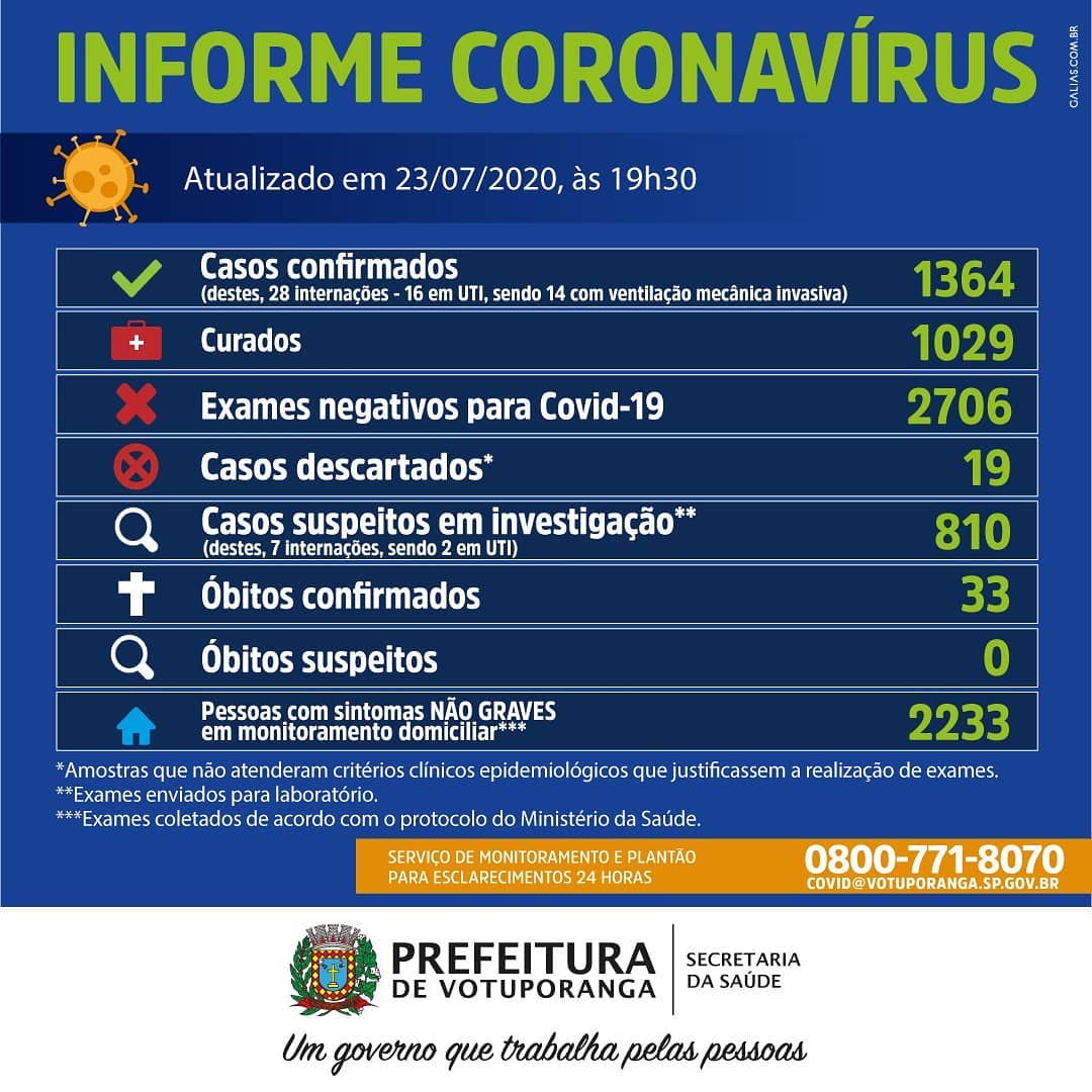 Votuporanga tem agora 1.364 casos confirmados, com 1029 curados e 2.706 testes negativos.