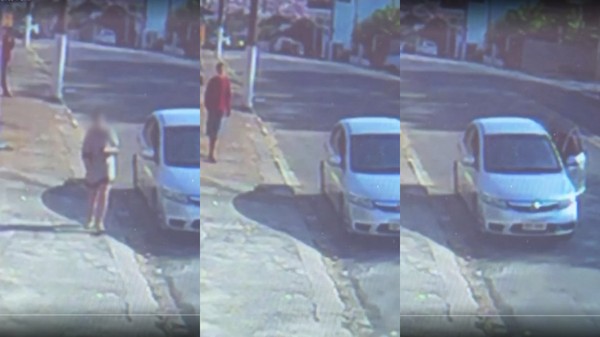 Na sequência, a mãe entra na loja enquanto o homem de blusa vermelha se aproxima do veículo, entra e vai embora levando o carro com a criança. Quando a mulher sai e não vê o automóvel, entra em desespero.