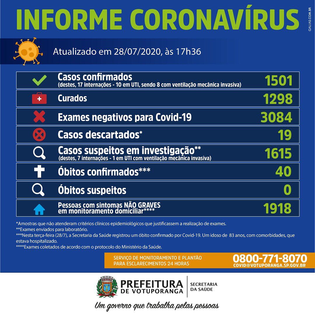 Votuporanga tem agora 1.501 casos confirmados, com 1.298 curados e 3.084 testes negativos.