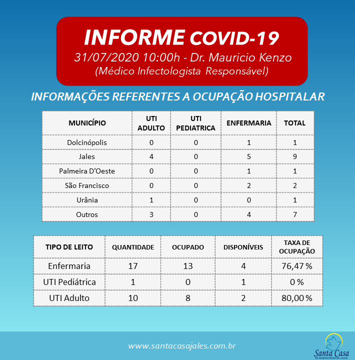 Os pacientes internados em enfermaria são: 5 de Jales, 2 de São Francisco, 1 de Dolcinópolis, 1 de Palneira d'Oeste e 4 de cidades não identificadas. Já na UTI, 4 pacientes de Jales, 1 de Urânia e 3 de cidades não identificadas.
