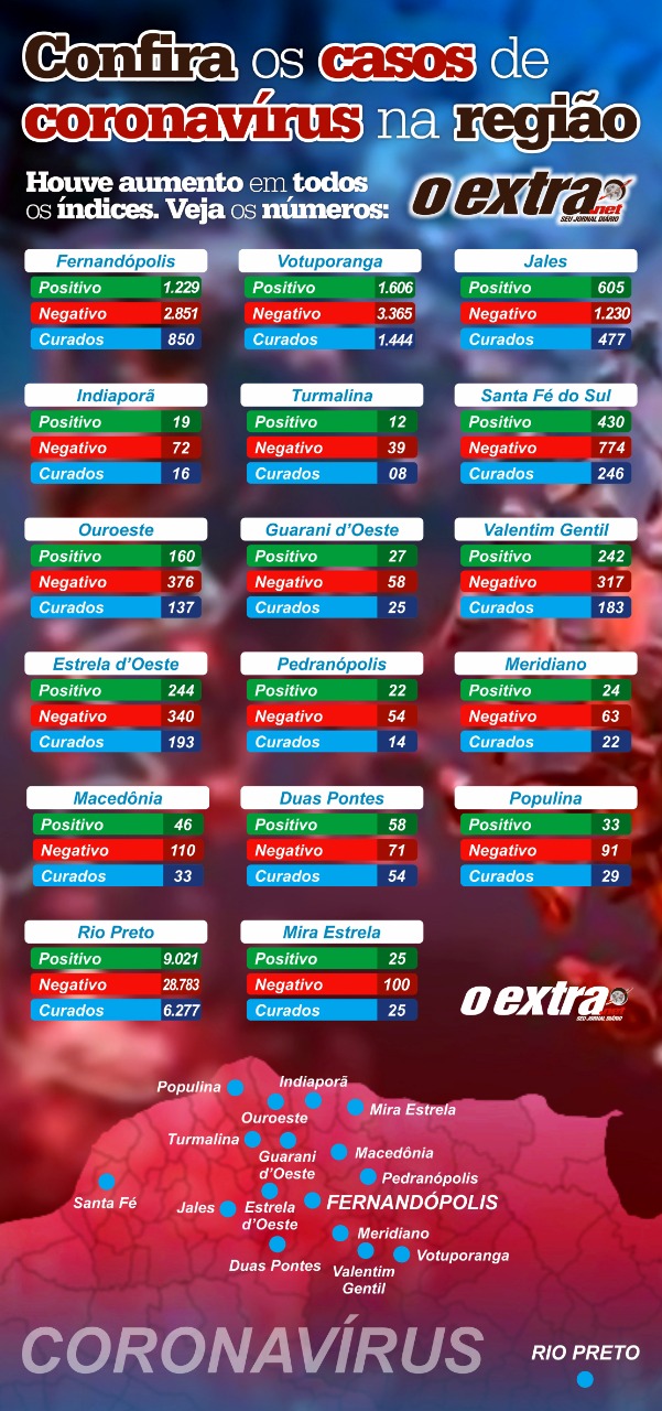 Santa Fé do Sul, que tomou medidas drásticas contra a doença, termina a semana com 430 casos positivos e 18 óbitos, e Jales com 605 testes e com oito mortes pela doença.