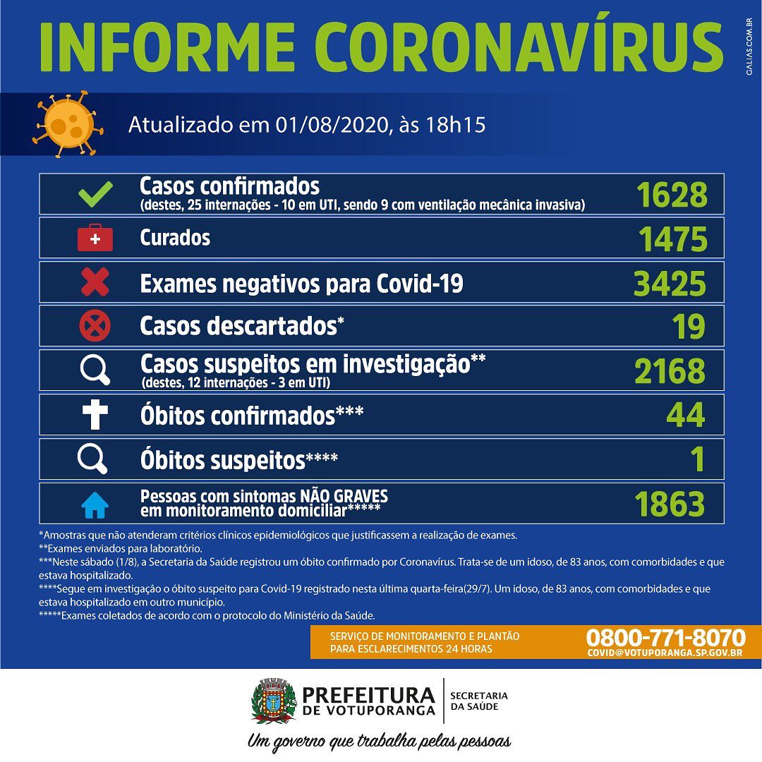 Votuporanga tem agora 1.628 casos confirmados, com 1.475 curados e 3.425 testes negativos.