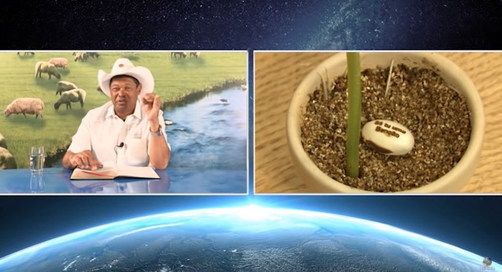 O pastor Valdemiro Santiago de Oliveira, líder da Igreja Mundial do Poder de Deus (IMPD), anuncia sementes de feijão com supostos poderes de curar a Covid-19. — Foto: Reprodução/Youtube