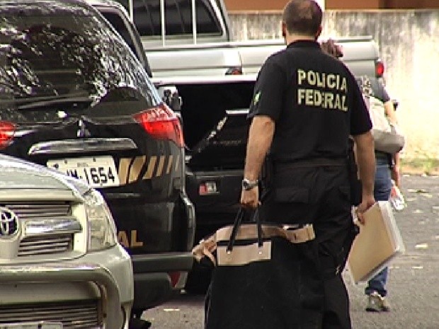 Policial federal carrega material apreendido durante a Operação Fratelli (Foto: Reprodução/TV Tem)