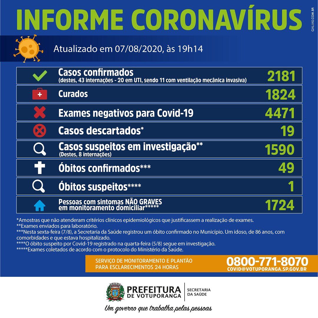 Votuporanga tem agora 2.181 casos confirmados, com 1.824 curados e 4.471 testes negativos.