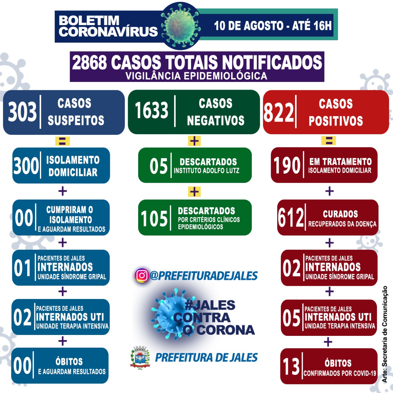 O município soma 822 casos positivos, com 612 curados.