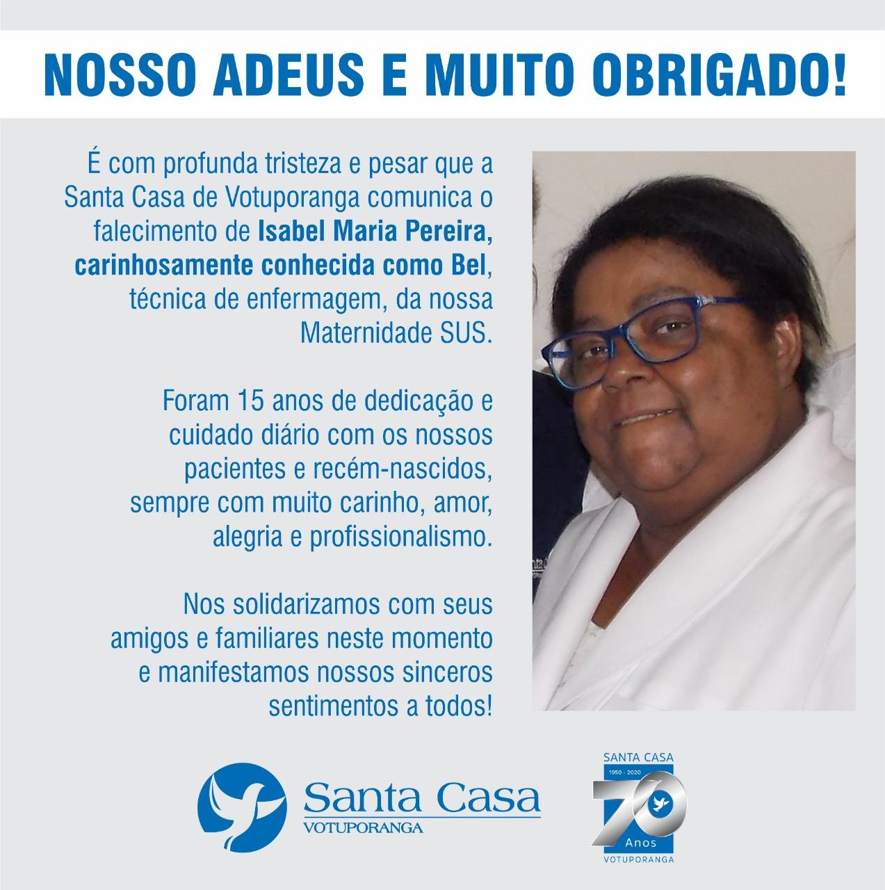 Em Nota Oficial a Santa Casa de Votuporanga disse Isabel Maria Pereira, conhecida como Bel, era Técnica de Enfermagem da Maternidade (SUS). “Foram 15 anos de dedicação e cuidado diário com os nossos pacientes e recém-nascidos, sempre com muito carinho, amor, alegria e profissionalismo. Nos solidarizamos com seus amigos e familiares neste momento e manifestamos nossos sinceros sentimentos à todos.”