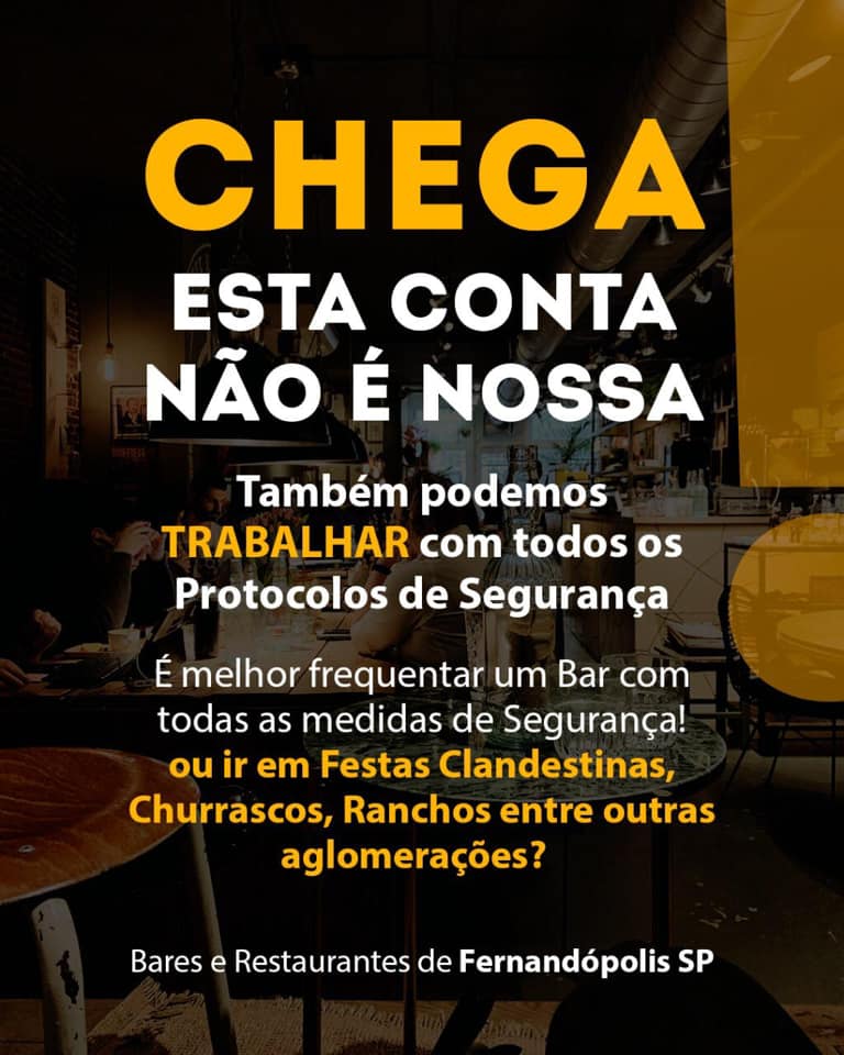 Os donos de bares e restaurantes de Fernandópolis vão esperar uma resposta da Prefeitura até esta quinta-feira, 13, para decidir se abrem ou não, em revelia ao posicionamento da DRS de Rio Preto, que está na fase laranja – com proibição da abertura de bares e restaurantes para consumo no local - do Plano SP.