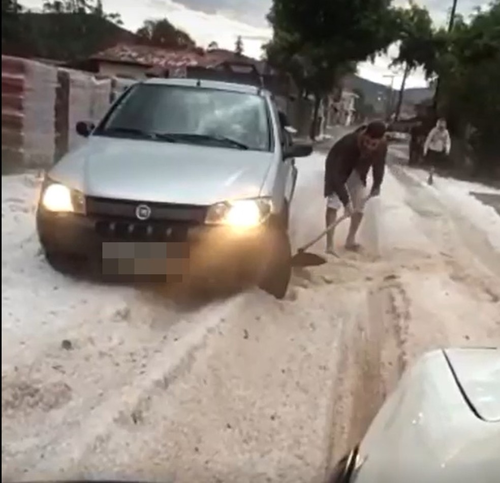 Em Ibitiúra de Minas, as pedras de gelo foram vistas em vários pontos. A prefeitura informou que está fazendo a limpeza. Algumas plantações de tomate ficaram destruídas. Foram 10 minutos de chuva de granizo.
