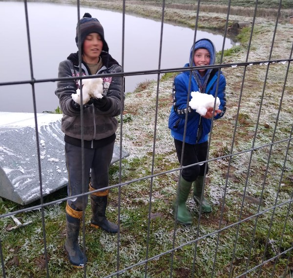 Marcos e Estevão Weiler conseguiram brincar com a neve em São Francisco de Paula nesta quinta-feira (20) — Foto: Ester Braun Weiler/Arquivo Pessoal