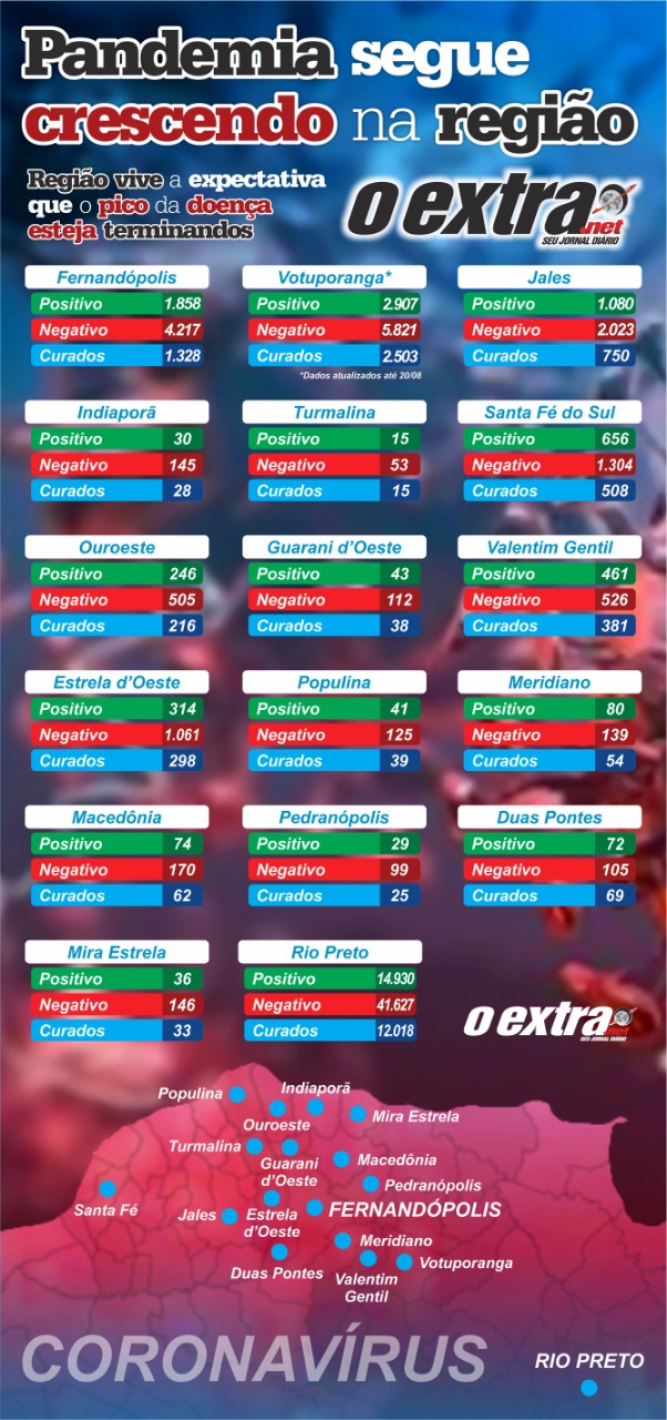 Santa Fé do Sul, que tomou medidas drásticas contra a doença, termina a semana com 656 casos positivos e 26 óbitos, maior taxa de letalidade da região. Jales passou de 1 mil casos e chegou em 1.080 testes positivos e 19 mortes pela doença.