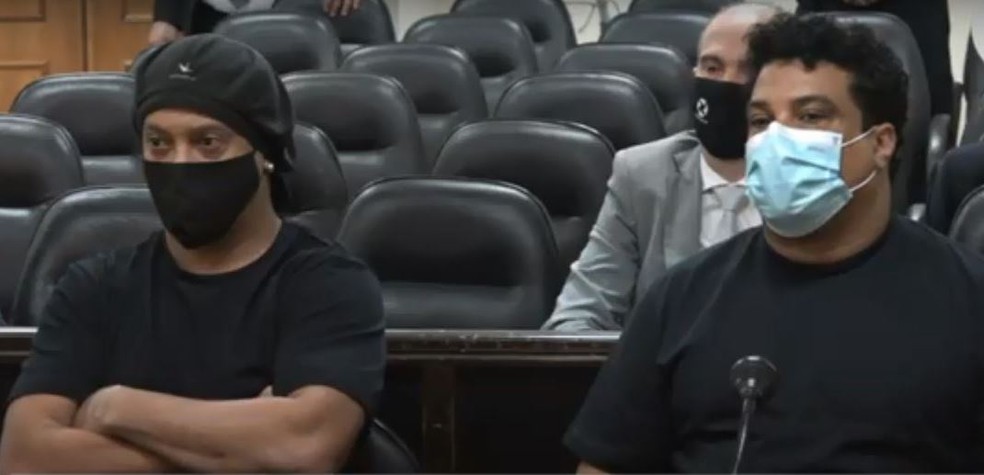 Ronaldinho Gaúcho e irmão Roberto Assis participaram de audiência, nesta segunda-feira (24), em Assunção — Foto: Tv Justicia Paraguay/Reprodução