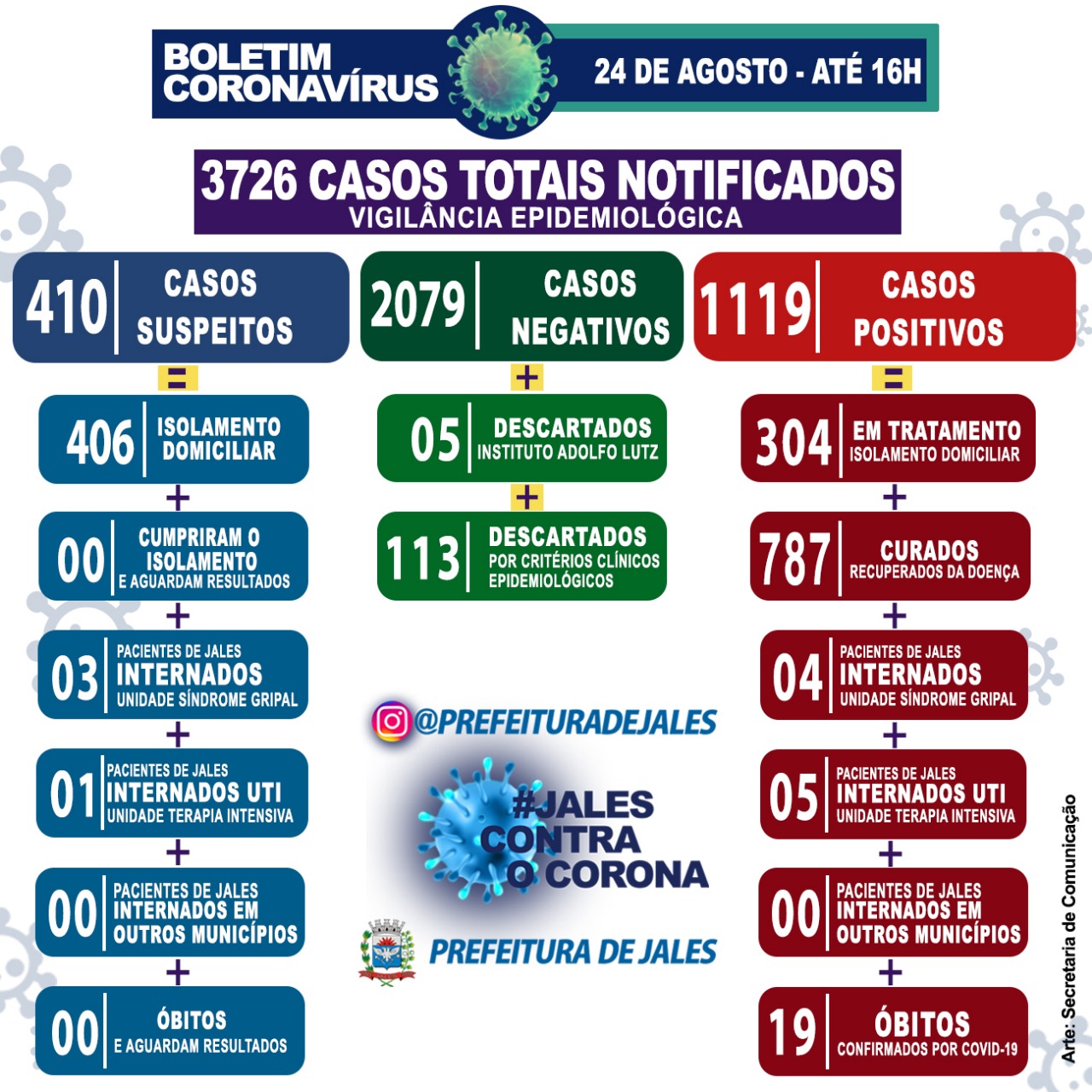 A Vigilância Epidemiológica Municipal informa que em 24 horas foram registrados 47 casos suspeitos para a Covid-19 (Coronavírus) em Jales. Também foram confirmados como positivos mais 05 casos em uma mulher de 20 anos; um adolescente de 14 anos; homens de 23, 43 e 45 anos.