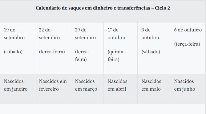 O calendário de pagamentos do auxílio emergencial é organizado em ciclos de crédito em conta Poupança Social Digital e de saque em espécie. Os beneficiários recebem a parcela a que têm direito no período de acordo com o mês de nascimento. Para os beneficiários nascidos em fevereiro, os saques e transferências serão liberados no dia 22 de setembro.