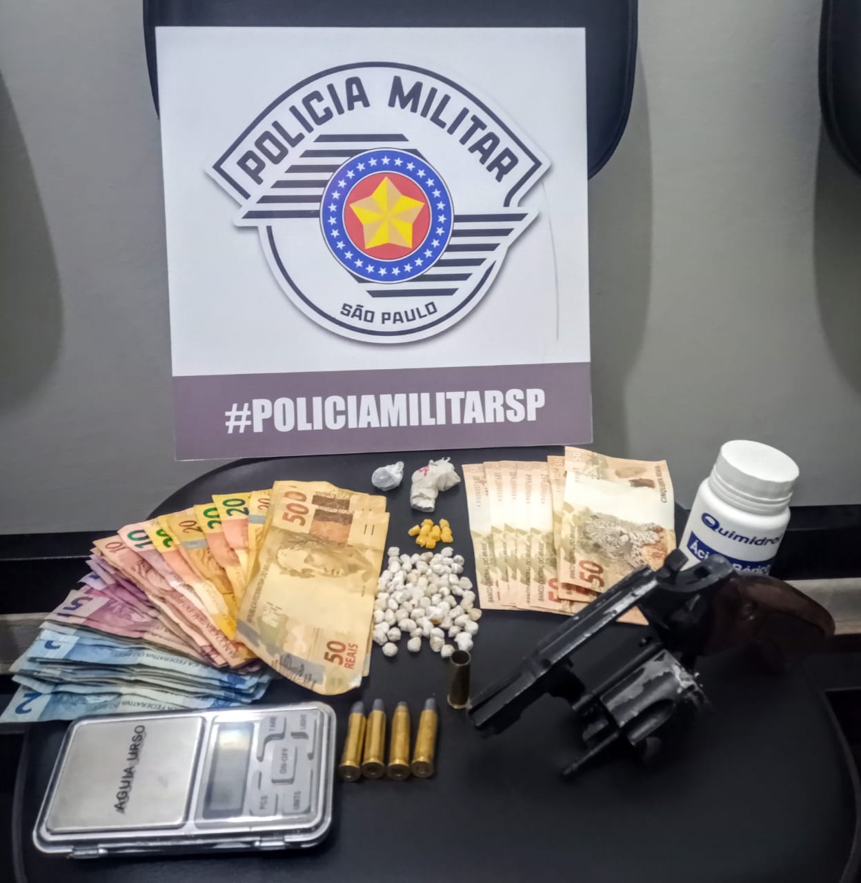Na oportunidade, a Polícia apreendeu 92 pedras de crack, 2 porções de maconha, 1 porção de cocaína, R$ 761,00 em espécie, 1 balança de precisão, 1 revólver calibre.38 com cinco munições, sendo uma deflagrada, 2 veículos, um Gol e uma Parati, 3 telefones celulares, apetrechos para embalar drogas e 1 caixa de som, produto de furto em uma escola, sendo reconhecida pela diretora que compareceu ao Distrito Policial.
