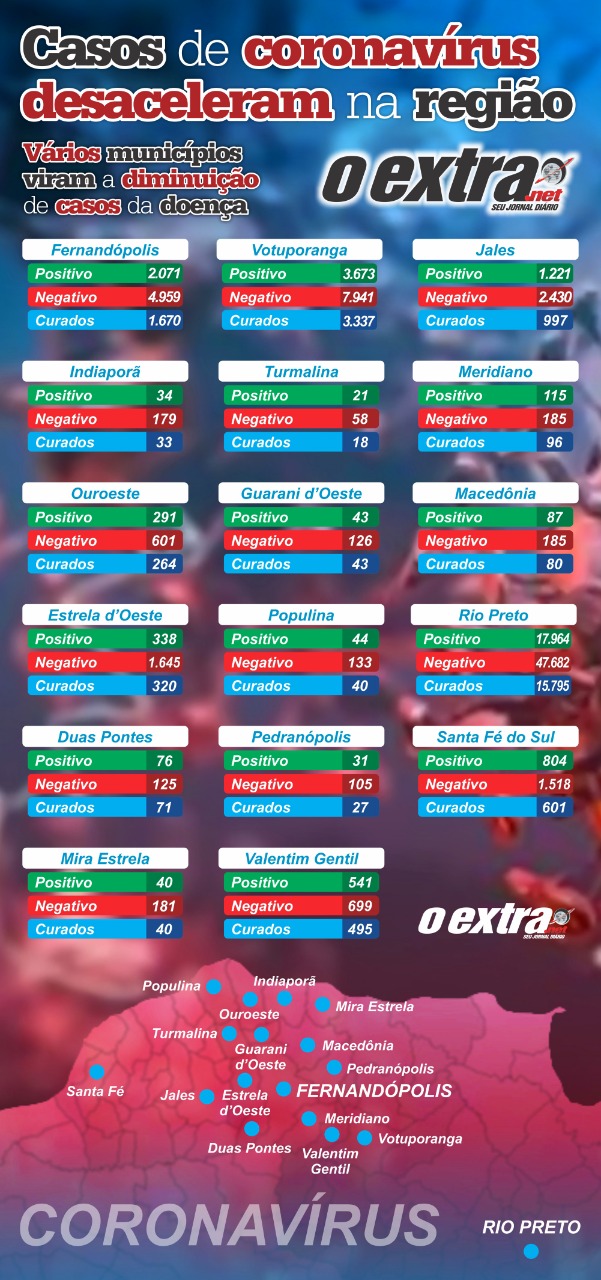 Santa Fé do Sul, que tomou medidas drásticas contra a doença, termina a semana com 804 casos positivos e 28 óbitos, maior taxa de letalidade da região. Jales tem 1.291 casos e chegou em 2.430 testes positivos e 27 mortes pela doença.