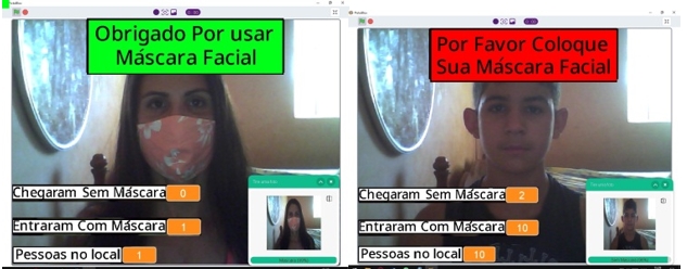 Com a realização dos testes, o trabalho concluiu que o sistema inteligente possui uma alta taxa de acerto, chegando a de 97,3% na identificação do uso da máscara facial. Na contagem do número de pessoas que estão presentes no ambiente o sistema não apresentou erros e emitiu os alertas e orientações corretas, impedindo que mais pessoas adentrem ao ambiente quando um limite de segurança é atingido.