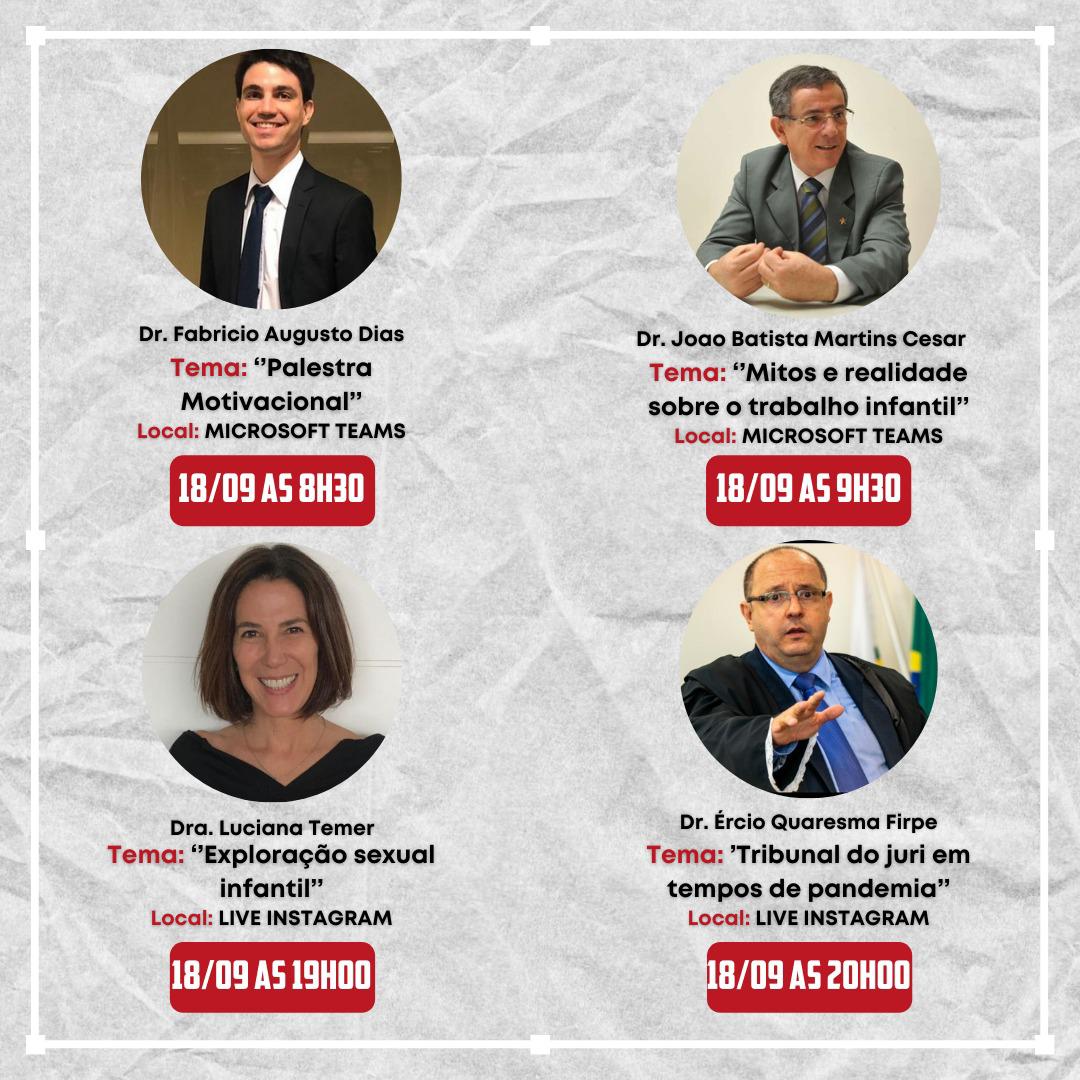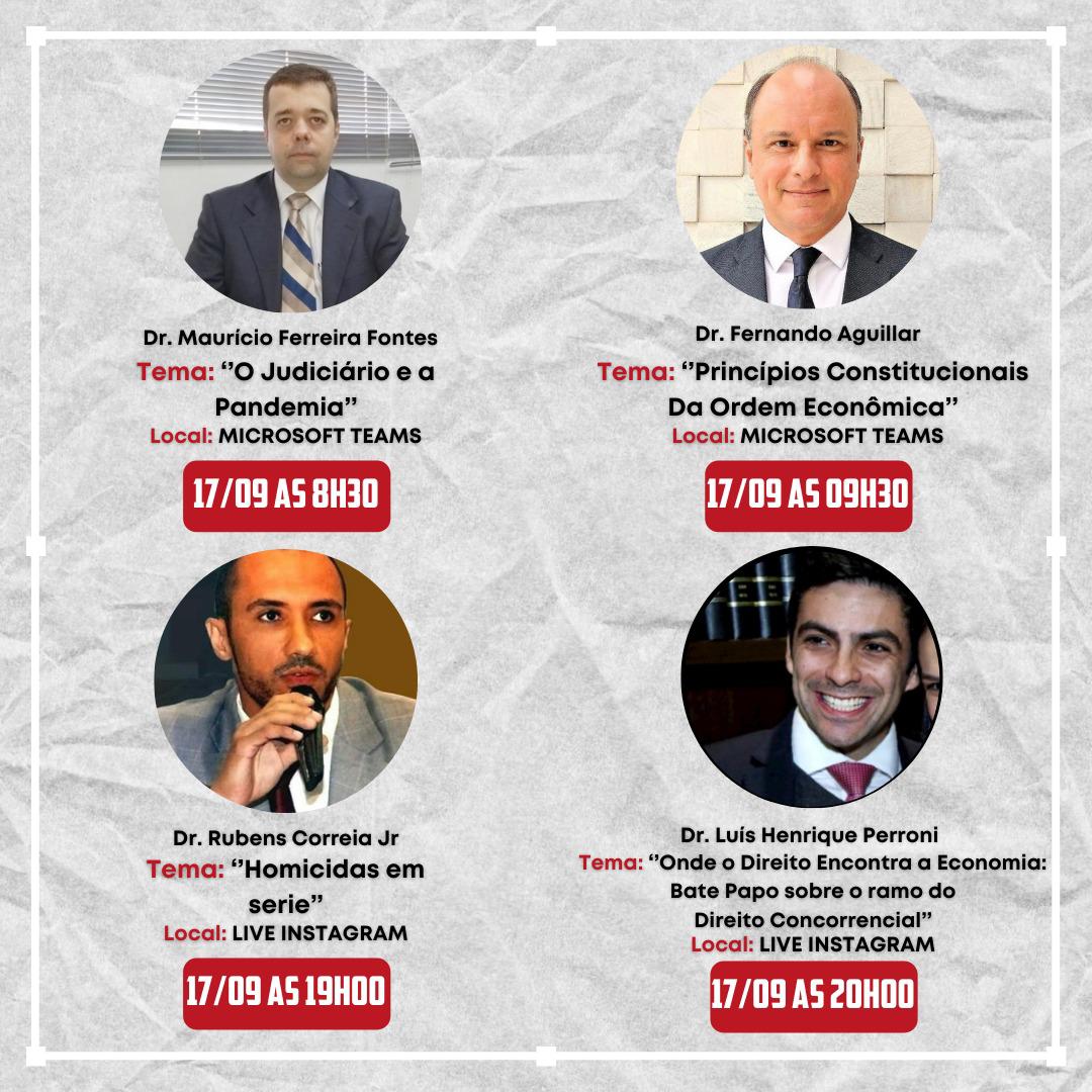 Todas as palestras serão transmitidas pelo Instagram da Atlética (@atleticadireitoferpa), até as que serão pelo Microsoft Teams, objetivando que todos, que tenham interesse, possam acompanhar os temas abordados. Hoje, dia 16, a abertura do evento contará com a presença da Reitoria, Direção e Coordenação do campus.