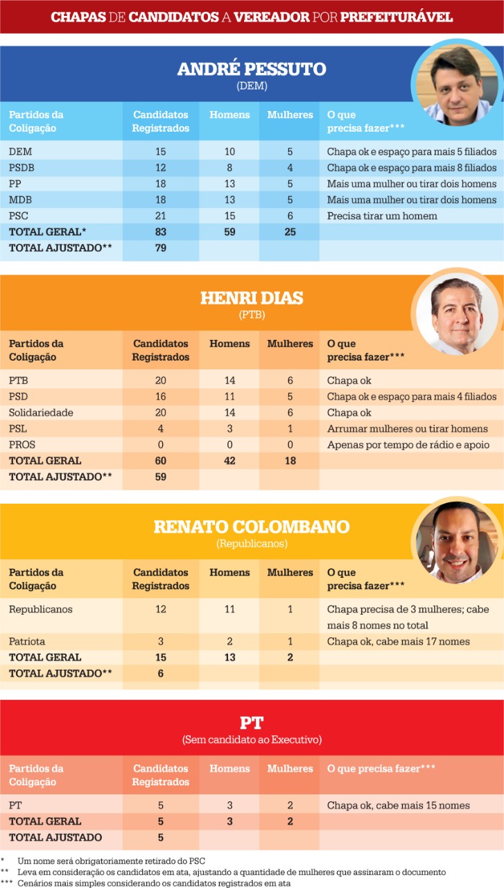 O empresário Renato Colombano, do Republicanos, que tem o apoio do Patriota, lançou 12 candidatos em seu partido e três na outra legenda coligada. Os dirigentes das duas siglas tentam aumentar o número para 18 no partido do candidato a prefeito e 10 no Patriota.