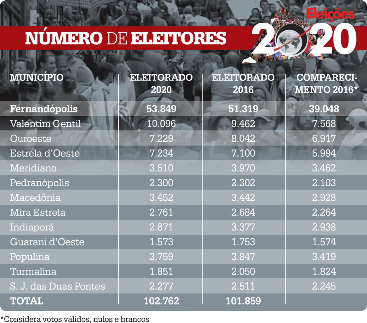 A microrregião de Fernandópolis tem neste ano 38.817 eleitores aptos ao voto. Em Valentim Gentil, que também faz parte da área de abrangência de O Extra.net, são 10.096 eleitores. Nestas 12 cidades serão, de acordo com as atas registradas nas convenções partidárias, 31 candidaturas ao Executivo.