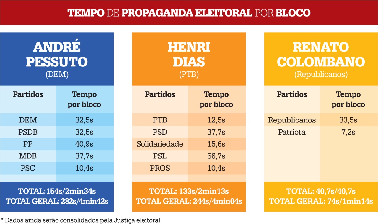Os partidos que compõe a coligação de André Pessuto (DEM) têm, somados, 154 segundos de propaganda eleitoral; os de Henri Dias (PTB) 133 segundo e os de Colombano 74 segundos.