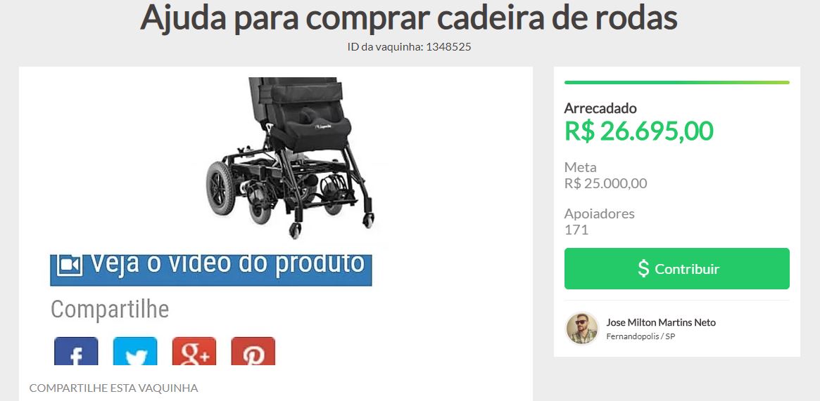 Neto ainda salienta: “o objetivo era R$ 25 mil, pois eu preciso de uma cadeira de rodas motorizada Stand Up, uma que fica em pé e que irá aliviar a minha circulação sanguínea. Muito feliz com a ajuda das pessoas”. A “vaquinha” online arrecadou R$ 26.695,00