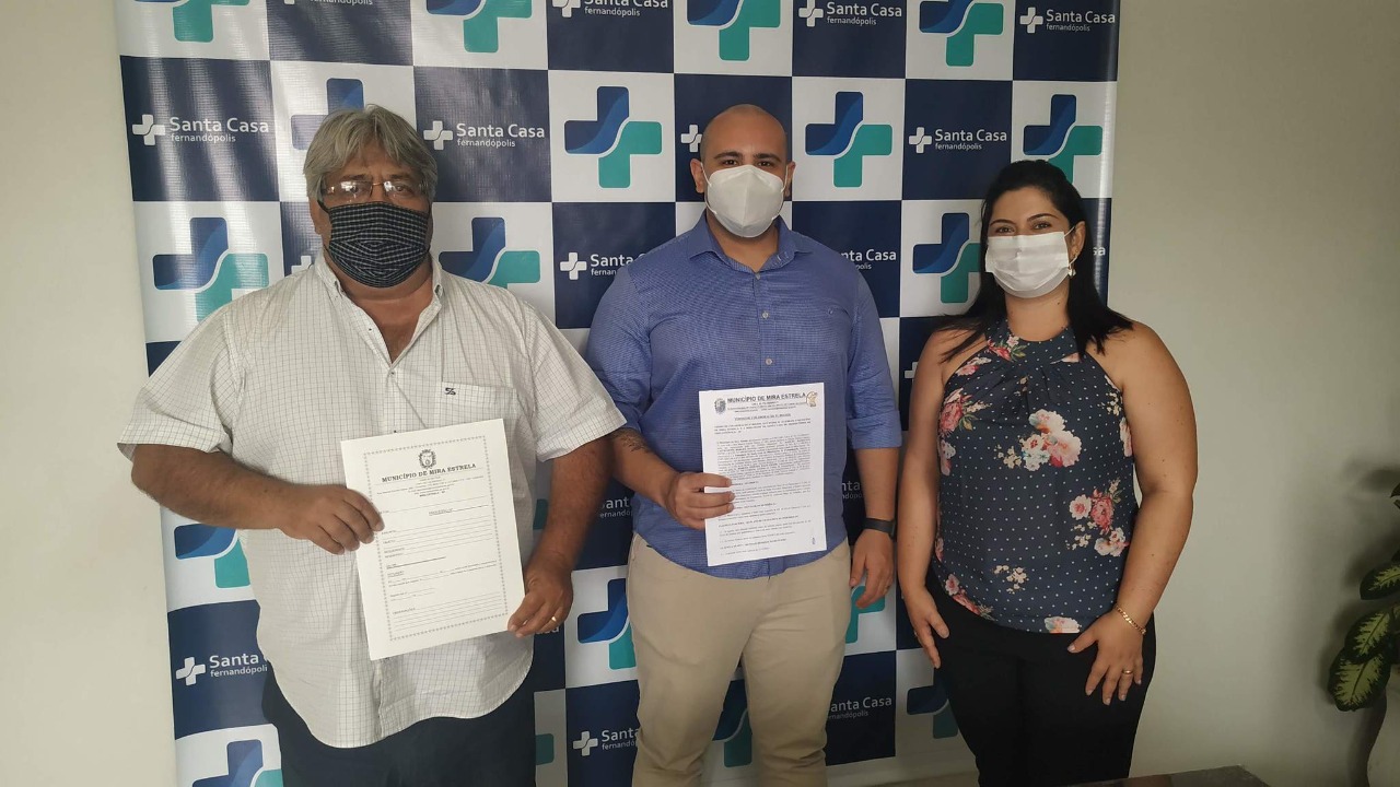 Na última sexta-feira, dia 18, o provedor da Santa Casa de Fernandópolis, Marcus Chaer, recebeu na instituição o prefeito de Mira Estrela, Marcio Castrequini, juntamente com a coordenadora de Saúde, Danila Botelho. Na ocasião, foi assinado o termo de fomento que destinará em parcela única cerca de R$ 47 mil do município à Santa Casa. O valor repassado será utilizado na luta contra a Covid-19.